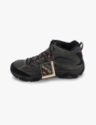 -  Bota de montaña hecha en cuero y malla de color gris.