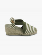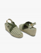 - Alpargata de yute y tejido a rayas beige y verde con elástico verde.