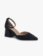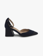 -  Zapato en ante y charol azul marino con tira al tobillo.