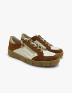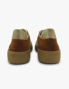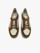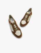 -  Sneakers hechas en piel de color beige, y oro y nobuck camel.