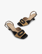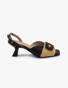 -  Sandalia en canasta natural y piel negra con hebilla en el empeine.